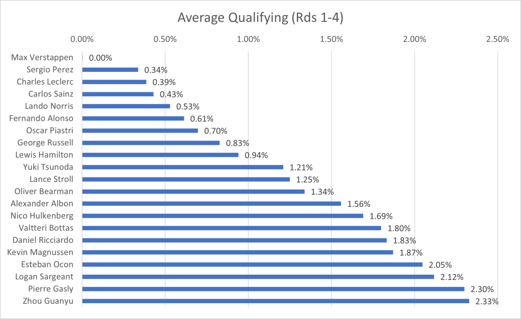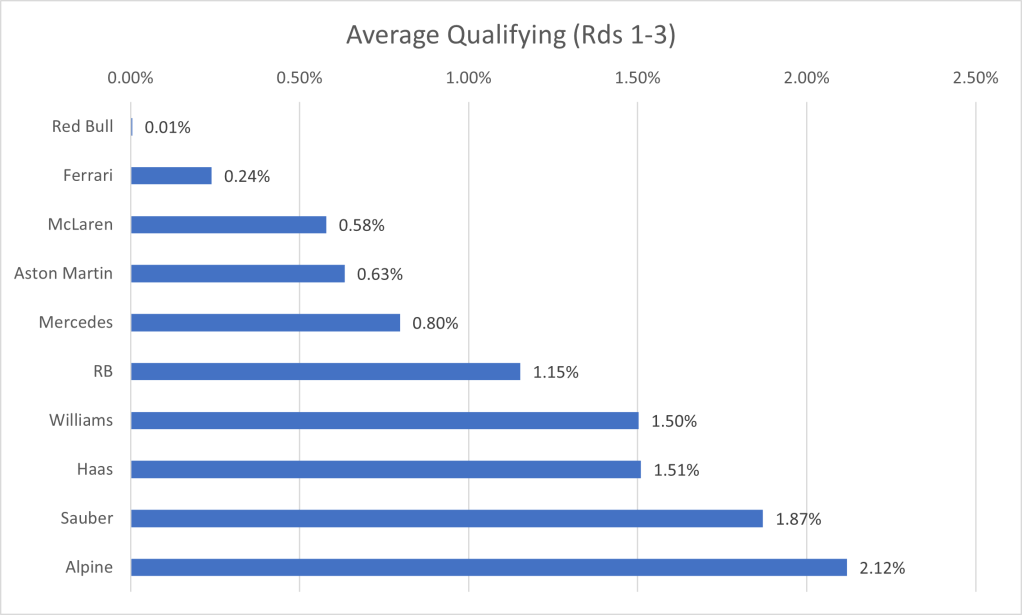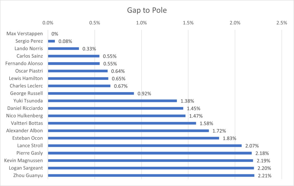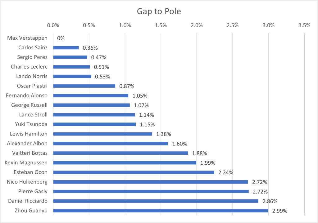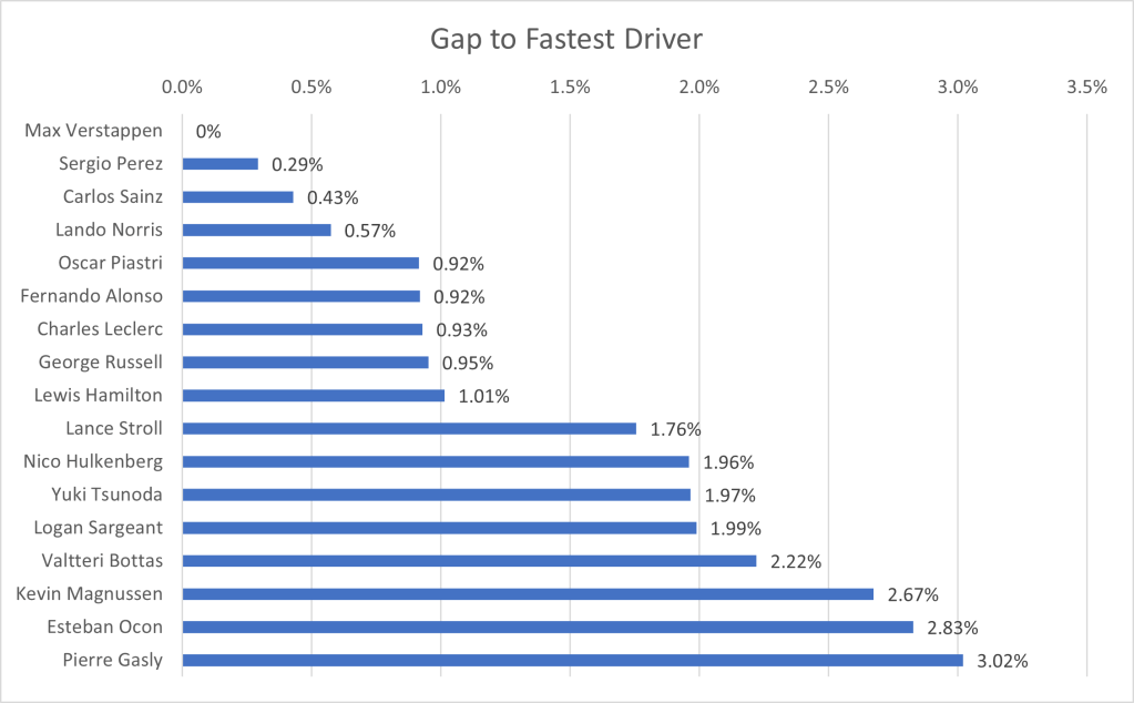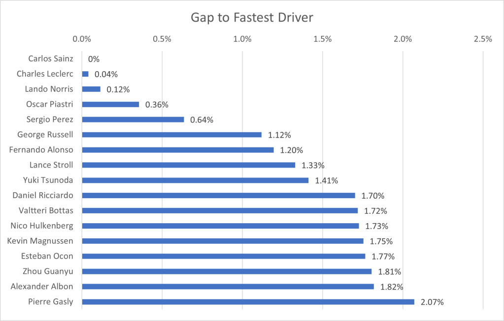 I have collated the fastest laps by each driver in qualifying, to show the average gap to the fastest driver. One caveat that arises, is that the top 10 drivers, through progressing to the final qualifying session, have a better track condition that those who only took part in Q1 or Q2. Due to this, the gap will be larger for the drivers outside the top ten than if qualifying was performed in one representative session. However, since the final session represents the point at which the top drivers are truly pushing, I’ve ruled it a better grounding point for the true limit of the cars, rather than only focusing on the first qualifying session in which the best times are not recorded.