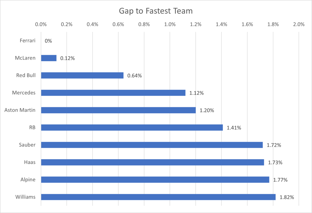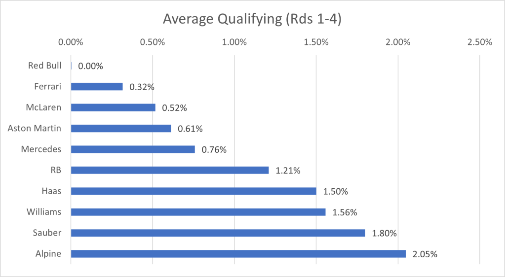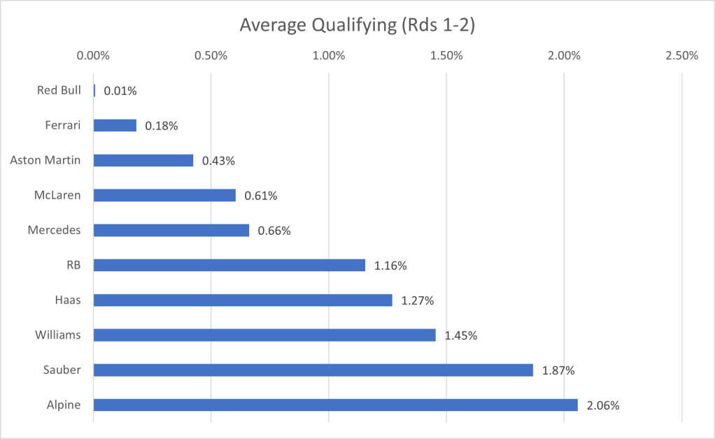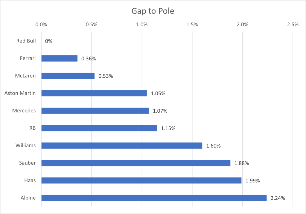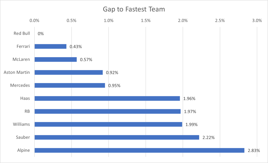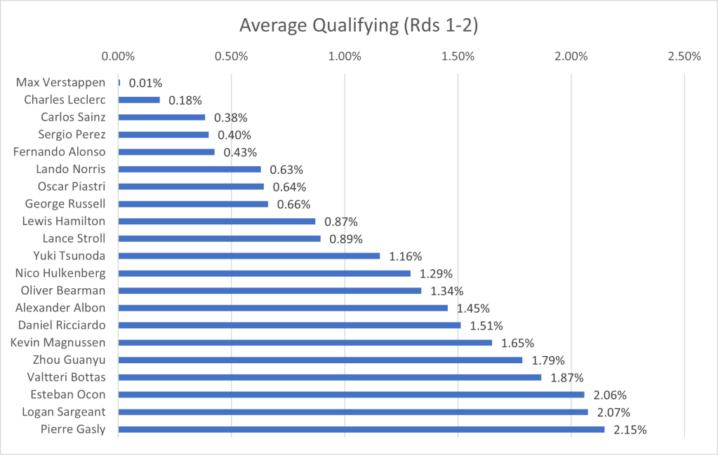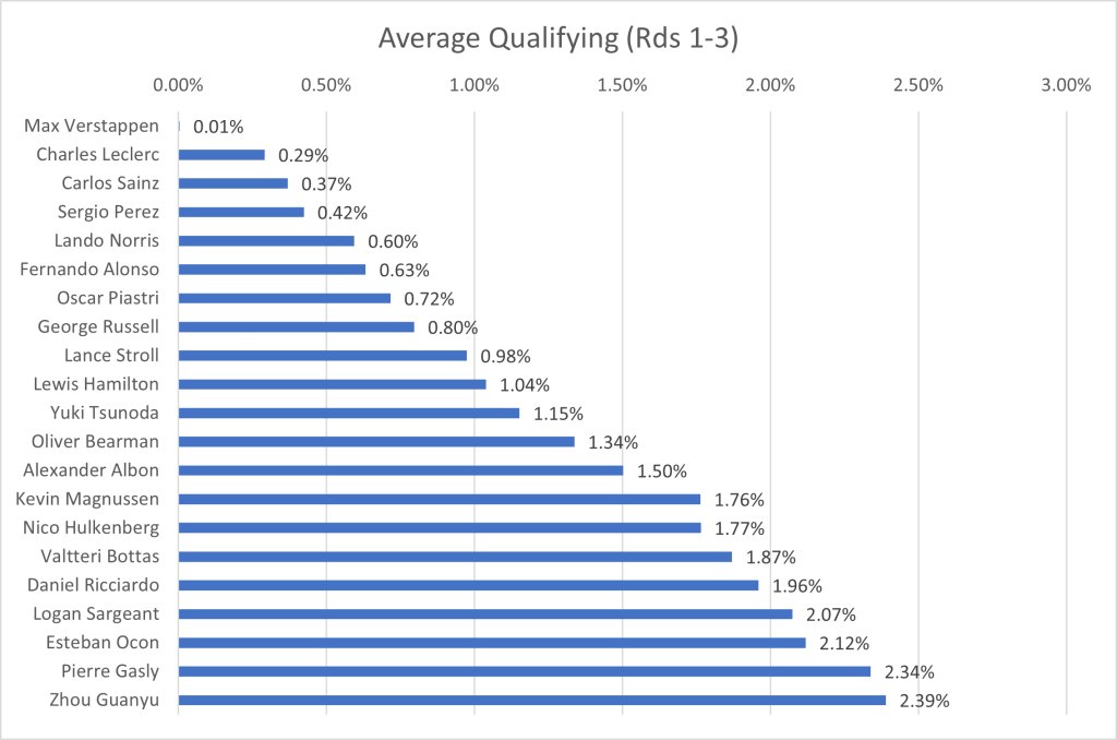 I have collated the fastest laps by each driver in qualifying, to show the average gap to the fastest driver. One caveat that arises, is that the top 10 drivers, through progressing to the final qualifying session, have a better track condition that those who only took part in Q1 or Q2. Due to this, the gap will be larger for the drivers outside the top ten than if qualifying was performed in one representative session. However, since the final session represents the point at which the top drivers are truly pushing, I’ve ruled it a better grounding point for the true limit of the cars, rather than only focusing on the first qualifying session in which the best times are not recorded.