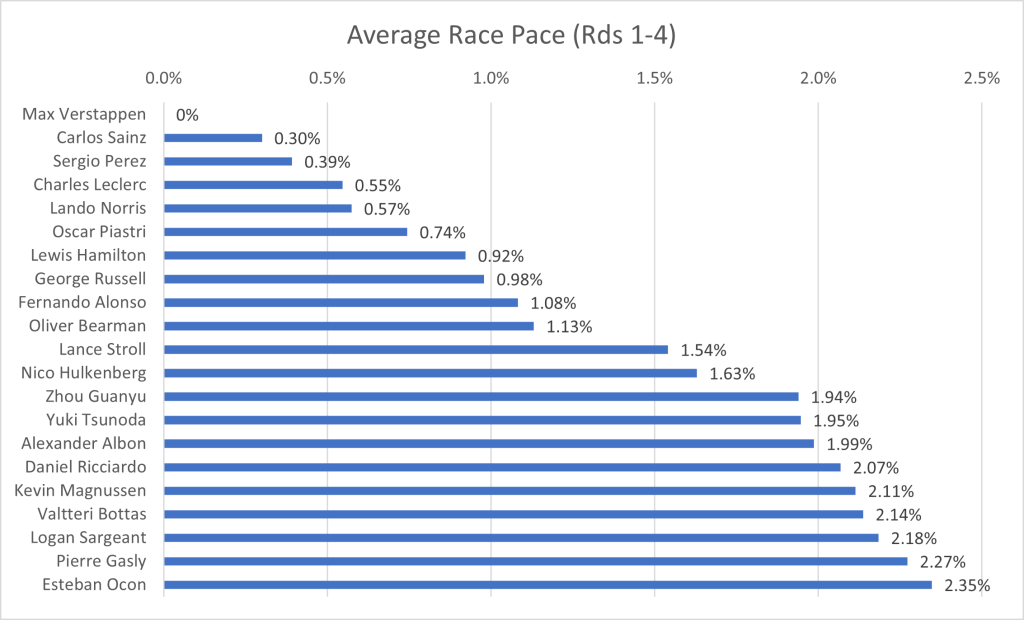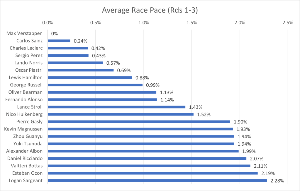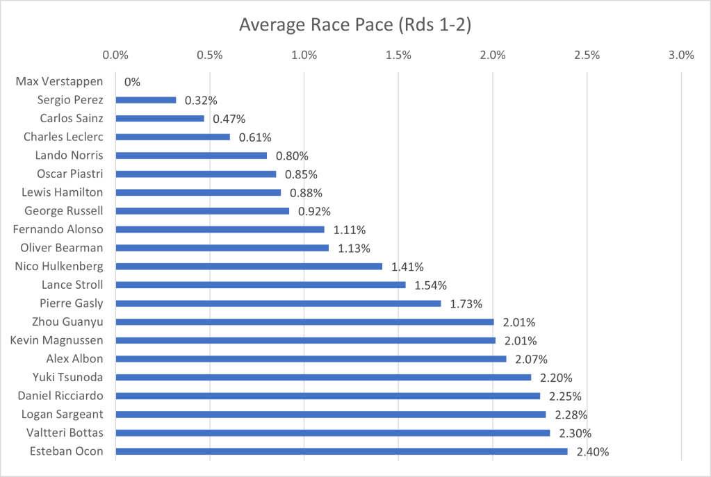 As different drivers have a varying number of race stints, this skews the overall pace. Generally, if a driver makes more stops, their pace will be faster on average. This will be taken into account in my final thoughts and analysis. Additionally, the average pace per stint and number of stints are recorded at the bottom of this article, for those interested in viewing more precise estimates of pace relative to other drivers on the same stint.[2]