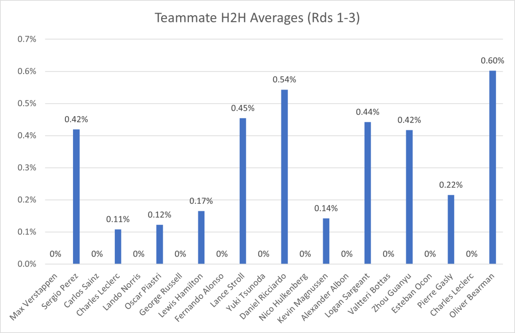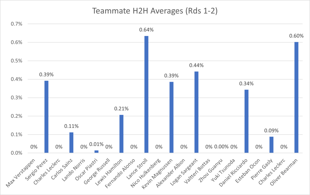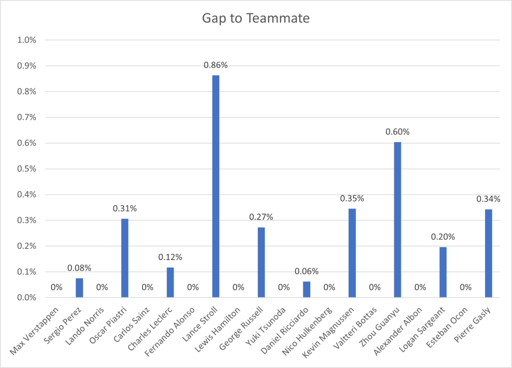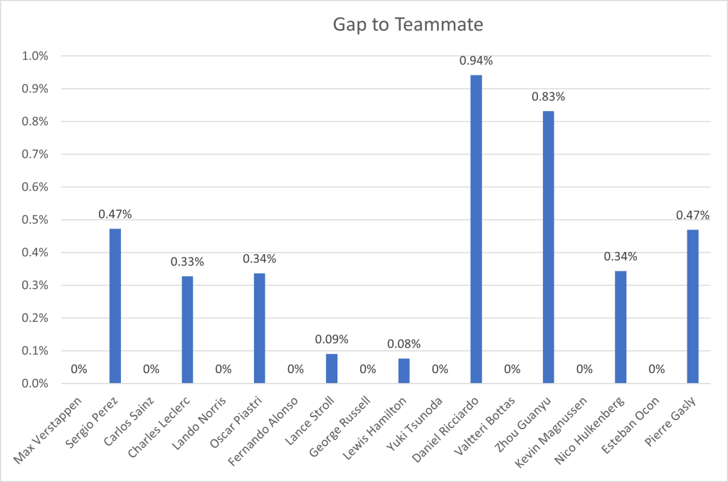 Additionally, I have collected the data for the gaps between teammates. I did this by using their fastest lap times set in the same session, so if one driver got into Q3, whilst the other only got into Q2, then I would count their Q2 times. Additionally, the lap times have to be representative, to avoid comparing out laps completed before a driver breaks down, as this would give us a very inaccurate representation of the drivers’ pace: