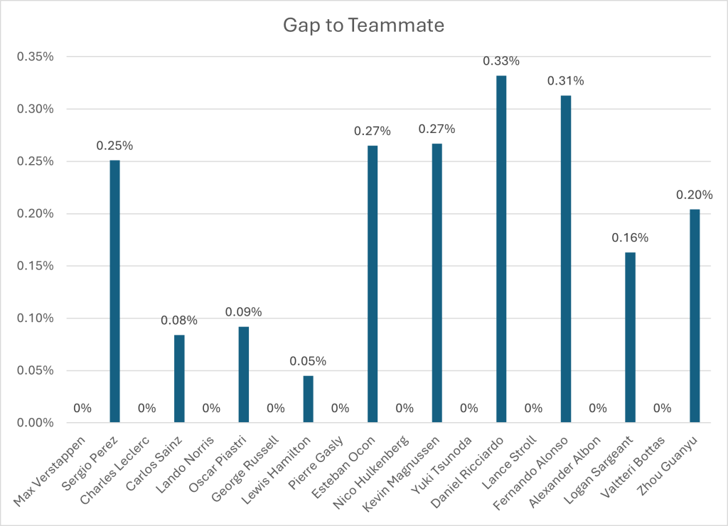Additionally, I have collected the data for the gaps between teammates. I did this by using their lap times set in the same qualifying session. I generally compare the last session both drivers competed in, however if the fastest driver drove their fastest time in an earlier session, I count these times instead.